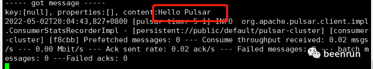 ./pulsar-client produce \persistent://public/default/pulsar-cluster \-n 1 \-m "Hello Pulsar"