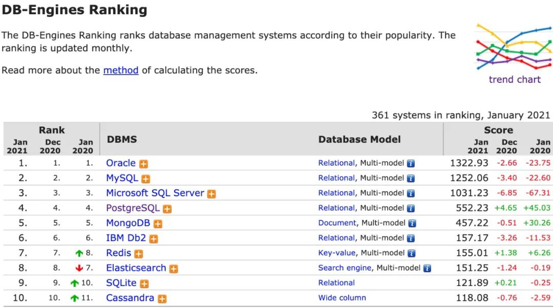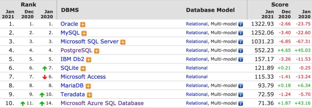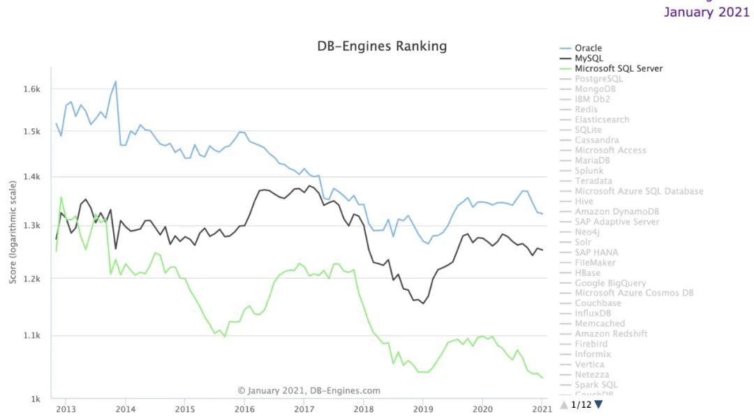 DB-Engines新的年度流行度排行榜出炉,2021年1月度排行榜上前三甲分别为 Oracle、MySQL 和 Microsoft SQL Server,这三者的名次已经稳定长达10年之久。在可以预见的5年之内,前三强的位置仍然不会改变。
