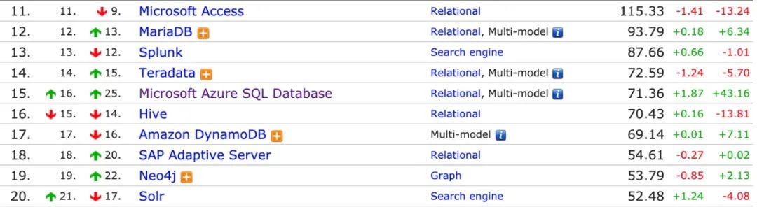 在11名至20名之中,有两大数据库产品值得注意,分别是 MariaDB 和 Azure SQL Database。