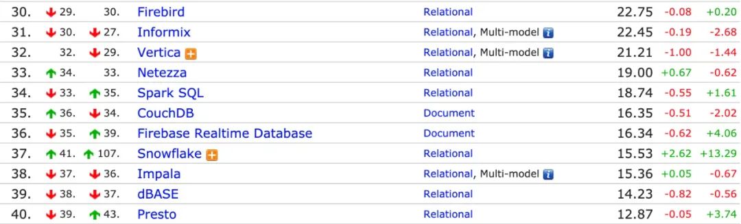 MariaDB 增长迅速,三年间将问鼎十强:MariaDB 积分已经达到了93.79分,如果将其记入 MySQL ,则 MySQL 的流行度是要超过榜首的 Oracle,事实上 MySQL 已经成为关系型数据库中的无冕之王。而 MariaDB 也仅仅比 第10名的 Cassandra 低约25 分,在未来 2~3年,MariaDB 将会跻身10强。下图是 Cassandra 和 MariaDB 的增长曲线,前者走平和略降,后者仍然保持增长:Azure SQL Database 增1.5倍,云数据库增长迅猛:微软的 Azure SQL Dadatae 最早是 SQL Server 的云版本提供,后来扩展到更广泛的数据库支持。在2020年获得了跳跃式的增长,自2020年1月的28分,增长到现在的71分,同比猛增43分。这说明了云数据库的增长迅猛。在中国,阿里云的 PolarDB 云数据库同样成绩引人瞩目。云数据库的发展是全球化趋势。在DB-Engines流行度排行榜上,另外一个如彗星般崛起的产品是 Snowflake,目前排在 37位,同比增长 13.29 分:从 Snowflake 的趋势曲线可以看出,其积分完全来自2020年9月之后的增长,从3分左右到现在的15分,5倍跃迁仅仅四个月,这就是明星产品 IPO 之后带来的行业影响力。最后,我们看一下关系型数据库的前10名,MariaDB 和 Azure SQL Database 都已经跻身前十: