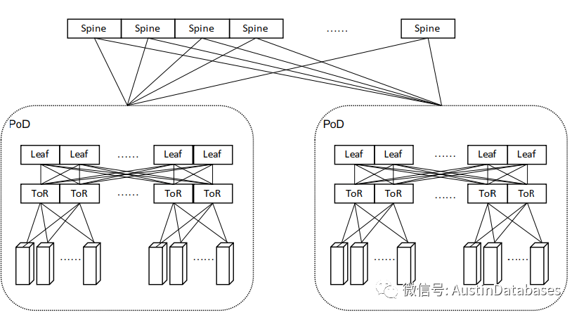 叶子交换机组由多个叶子交换机组成,它们同时提供服务,并互为备份。由叶子交换机组管理的机架和服务器的集合称为PoD(交付点)。一个PoD最多包含32组ToR,即超过1500台服务器,PoD中的服务器通过RDMA网络互联完成工作。