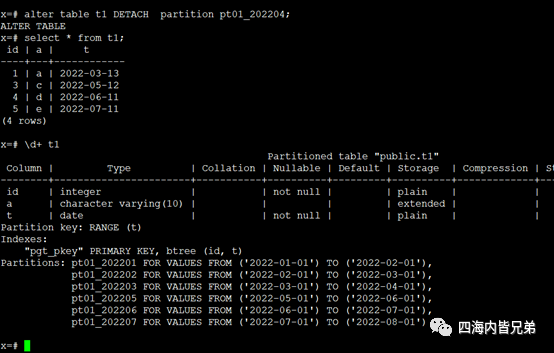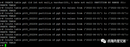 Create table pt01_202207 partition of pgt for values from ('2022-07-01') to ('2022-08-01');