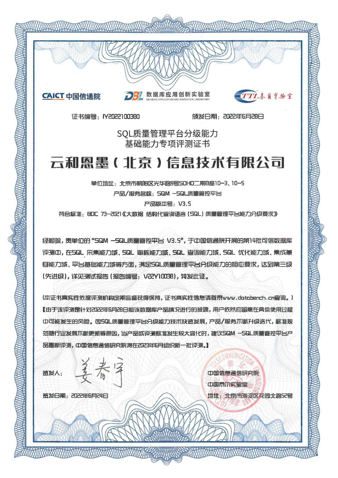 // 高分通过大数据SQL质量管理平台能力分级评测,SQM成为首个获颁最高级别 “先进级”证书的产品