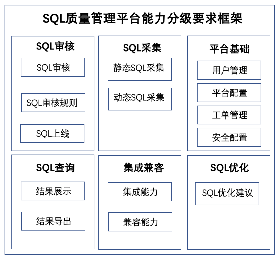 本次SQL质量管理平台能力专项评测从平台基础能力、SQL采集能力、SQL审核能力、SQL查询能力、SQL优化能力、集成兼容能力六大维度展开,测评结果分为基础级、增强级和先进级。基础级至少具备SQL采集、SQL审核、SQL查询和SQL优化等基础能力;增强级需具备辅助提升SQL质量管理的增强能力,如易用性等;先进级需具备智能化,能够大幅提升SQL质量管理效率的能力。