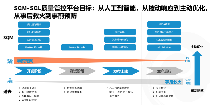 现代企业软件研发过程中,SQL质量问题存在于软件的全生命周期,在数据库代码设计环节,SQL问题一直层出不穷。长期以来,大部分数据库性能问题由应用开发产生的不良SQL、低效和不规范的表设计所致,并且在测试、开发过程中缺乏有效的审核管理和流程规范,导致SQL问题不能及时有效解决以致应用发布上线后,业务爆发各种SQL性能问题和安全问题,倒逼企业必须将SQL质量管控前置,问题SQL在其影响业务前就要及时发现并优化。