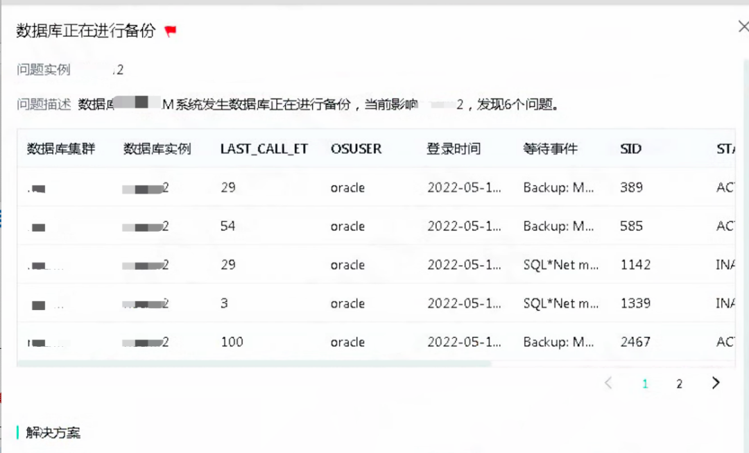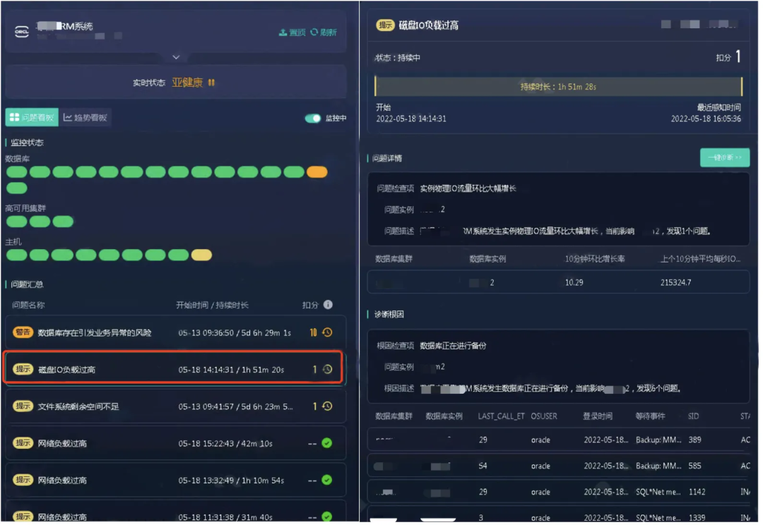 在实际环境中就发生过这样一个案例,运维人员收到提示,发现M系统“磁盘IO负载过高”,监控状态处主机层也呈现黄色亚健康状态提示。运维人员迅速登录 zCloud 点击“一键诊断”查看,显示 zCloud 诊断根因为“M系统数据库正在进行备份,影响了其中某个数据库实例,并发现了6个问题”。