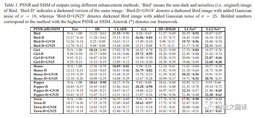 算法适应性:理想情况下,已经明亮的图像不应再进一步变亮。为了测试这一点,对正常,非黑暗和无噪声的图像执行了不同的增强算法。图4A显示了通过各种算法运行“镇”图像时的结果。 LLNet输出的图像稍微亮一些,但不会像GA输出那样使所有内容显得过亮和褪色。这表明在学习弱光特征的过程中,LLNet成功地学习了应应用于图像的必要亮度等级。但是,当通过目视检查评估对比度增强时,直方图均衡方法(即HE,CLAHE,HE + BM3D)在给定原始图像的情况下可提供出色的增强效果。如表1所示,在与其他图像(即“鸟”,“女孩”,“房子”,“胡椒粉”等)进行测试时,基于HE的方法通常在PSNR和SSIM较高的情况下效果稍好。