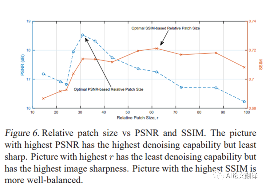 从结果中可以看出,当相对块大小减小时,对象边缘会显得更清晰,但会产生更多噪声。 然而,存在一个最佳的补丁大小,导致具有最高 PSNR 或 SSIM 的增强图像(如图 6 和图 8 所示)。 如果根据PSNR 选择最佳补丁大小,则生成的图像将具有最低的噪声水平,但不那么清晰。 如果选择了最小的块大小,则生成的图像具有最高的清晰度,可以观察到更多的细节,但会产生更多的噪点。 基于 SSIM 选择最佳的块大小会在去噪能力和图像清晰度方面产生更平衡的结果。