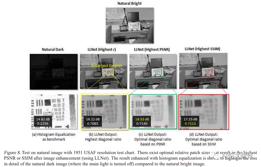 在自然低光图像上的应用:处理下载的图像时,可以使用干净的参考图像来计算 PSNR 和 SSIM。但是,在处理自然暗图像时,参考图像在现实生活中可能不可用。由于这是一个对照实验,我们通过将普通手机 (Nexus 4) 相机安装在三脚架上,在开灯和关灯的室内环境中拍摄照片来规避这个问题。开灯的图片作为 PSNR 和 SSIM 计算的参考图像,而关灯的图片成为自然的低光测试图像。虽然明亮的图片不能被认为是ground truth,但它为评估各种算法的性能提供了一个参考点。每种增强方法的性能如图 5 所示。虽然直方图均衡大大提高了图像的对比度,但它破坏了具有大量噪声内容的输出。此外,该方法在黑暗区域中存在非常高强度亮度的区域存在过度放大,如面板5A(vi)和5A(vii)中计算机显示器上的光晕效应所示。 CLAHE 能够提高对比度而不会出现显着的显示晕染,但与 HE 一样,它往往会放大图像中的噪点。 LLNet 的表现非常好,它能够抑制大多数图像中的噪声,同时提高局部对比度,如图 5 底部的放大补丁所示。
