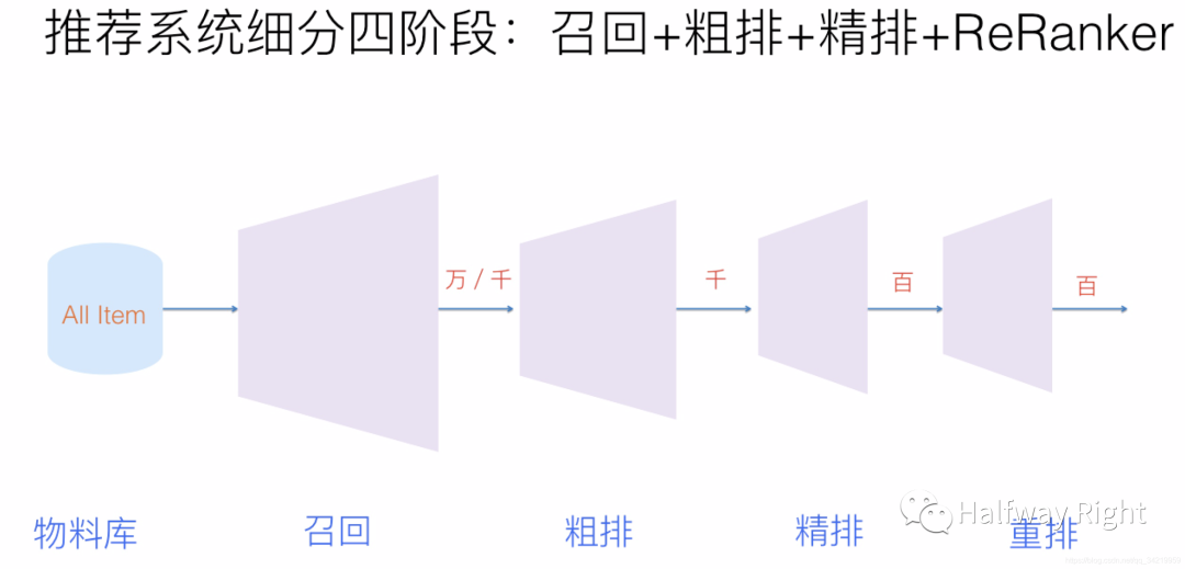 这次我们主要讲讲搜广推中的推荐模型(搜索,广告和推荐是互联网的三大核心应用),其实搜广推三个方向上的技术栈都大差不差。一个推荐系统大致由召回和排序两个阶段组成,其中召回主要用于召回需要推荐的item(主要根据不同的策略进行多路召回,比如用户标签,或者简单的模型,比如CF,召回候选的item集给后续排序模型使用);排序阶段主要使用复杂的模型,而根据其业务,数据量级,算力和技术的不同,排序阶段还会分出粗排,精排和重排这些细粒度的阶段,但本质都是尽量在最后使用复杂的模型对少量的item进行精准的排序,最后排序结果会结合业务逻辑进行千人千面的展示。这其实也是淘宝上推荐商品,抖音和Youtube推荐视频的大致过程。其实支付上的业务风控也是一样,支付风控上会主要分为可信和非可信两个阶段,其认为大部分交易都是值得信任的,然而计算资源是有限的,我们需要尽量使用有限的计算资源对那部分高风险非可信的交易使用复杂模型和业务逻辑进行精准的识别,而可信的交易只使用简单的策略或者模型进行防控。