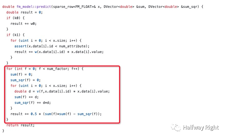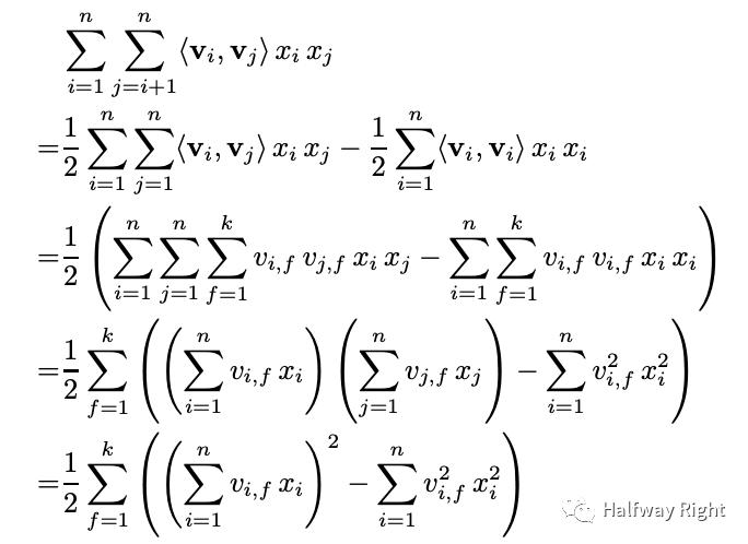 关于时间复杂度,如果我们直接用上面的公式去计算FM,我们的时间复杂度也是O(n^2),因为我们需要两个for循环来计算v_i v_j。那么通过下面的公式推导(Rendle, 2020),易得最后这个熟悉的sum_square - square_sum的计算公式,这样我们只需要一个for循环就可以完成FM的计算(k是隐向量维度),整个计算复杂度也降低为O(kn)。