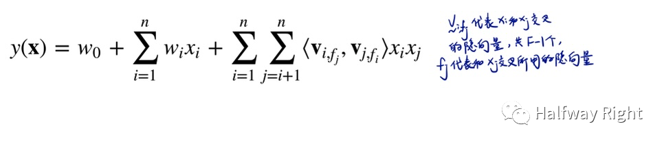 那FM是如何解决上面的问题的?我们用v_i和v_j的点积代替上述的interaction项,w_ij x_i x_j,其中v_i和v_j分别是特征i和j的隐向量,那么线性部分变为