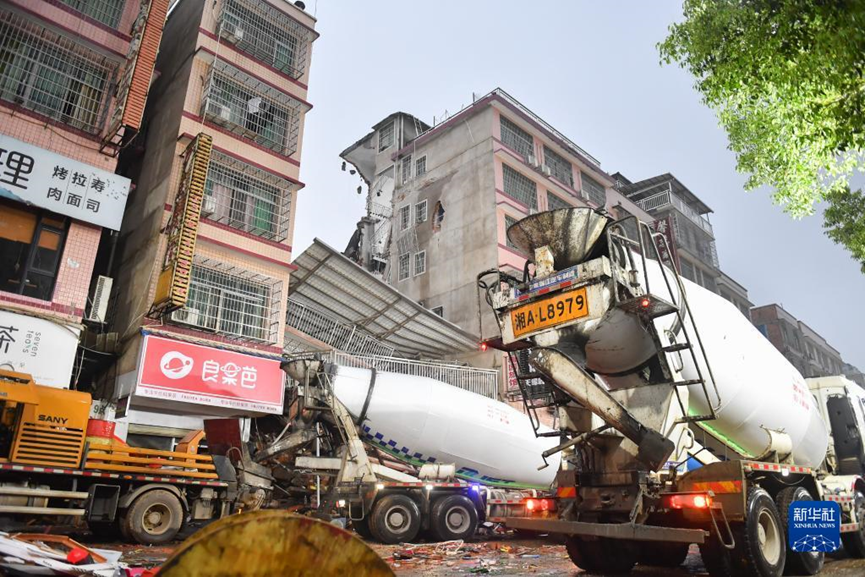 图1. 救援车辆在事故现场加固房屋 来源:新华社