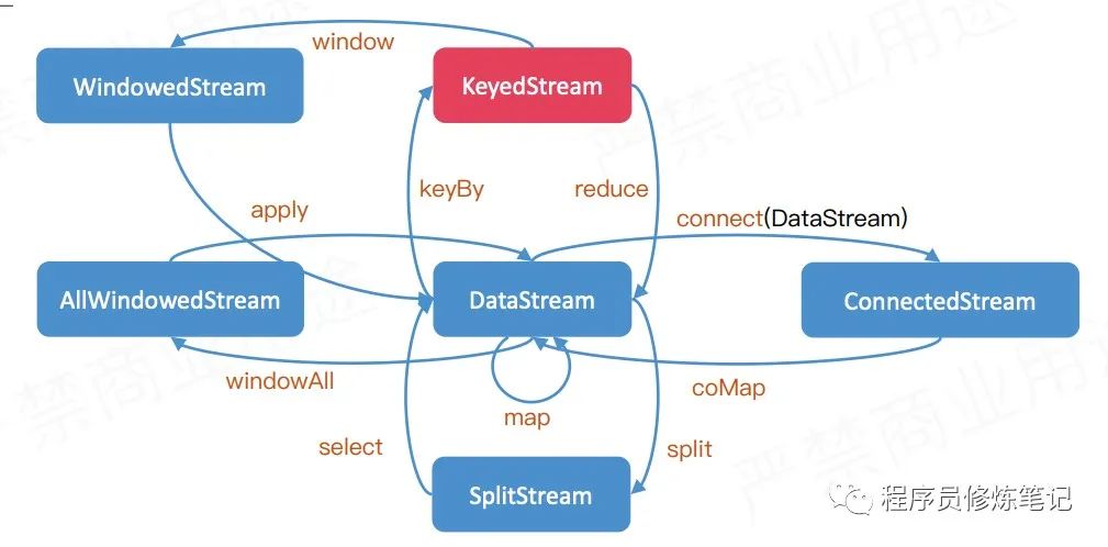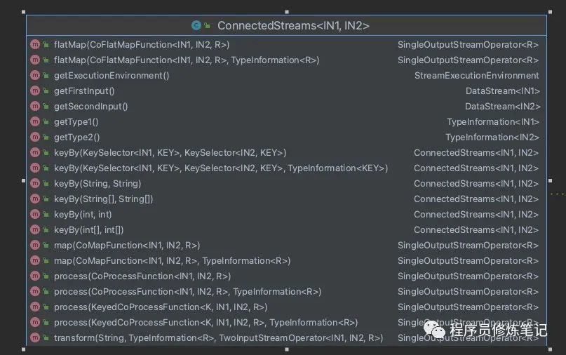 通过DataStream的connect方法我们可以将两个流进行合并,合并后的流就是ConnectedStreams,ConnectedStreams支持的操作如下图: