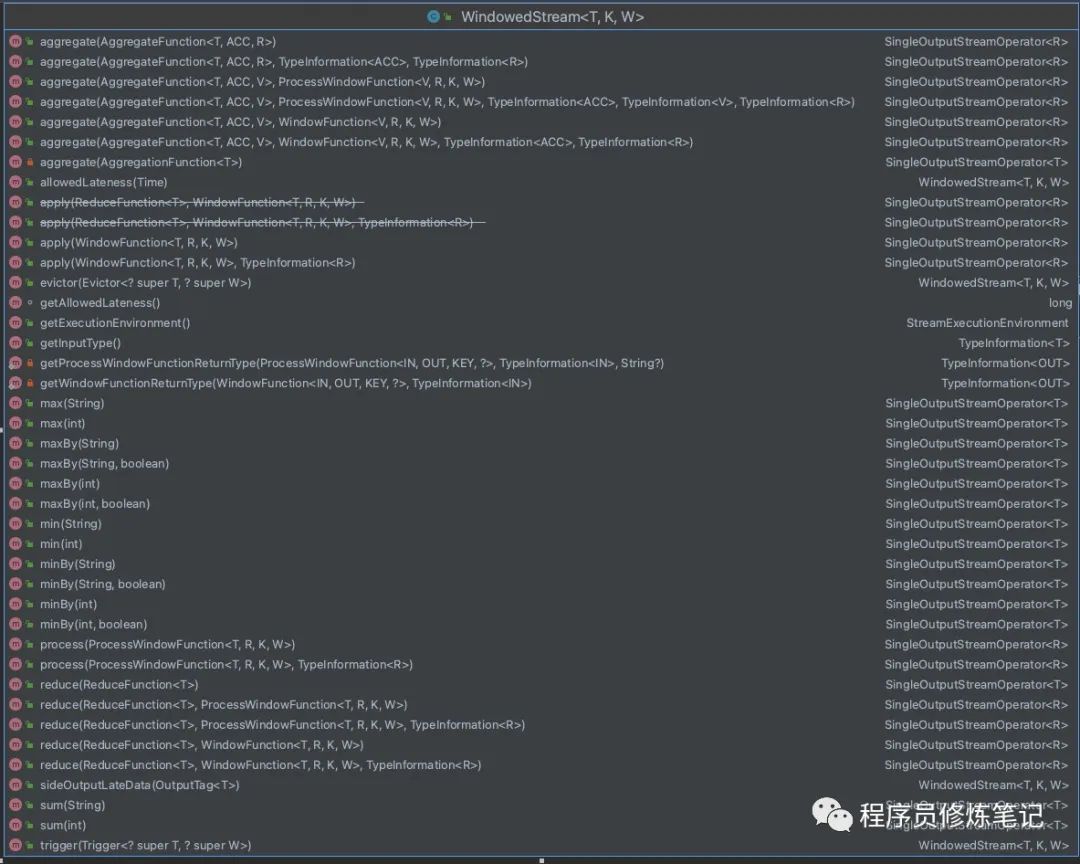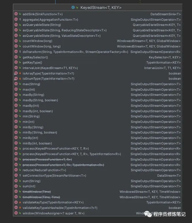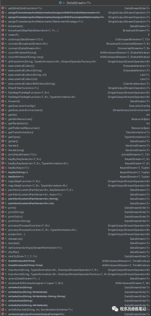 DataStream作为我们最基础的流处理类,我们可以通过一些方法可以其转换为其他形式的流,其中上图中的SplitStream在Flink 1.13.1版本已经进行了移除,现在DataStream中的方法如下图: