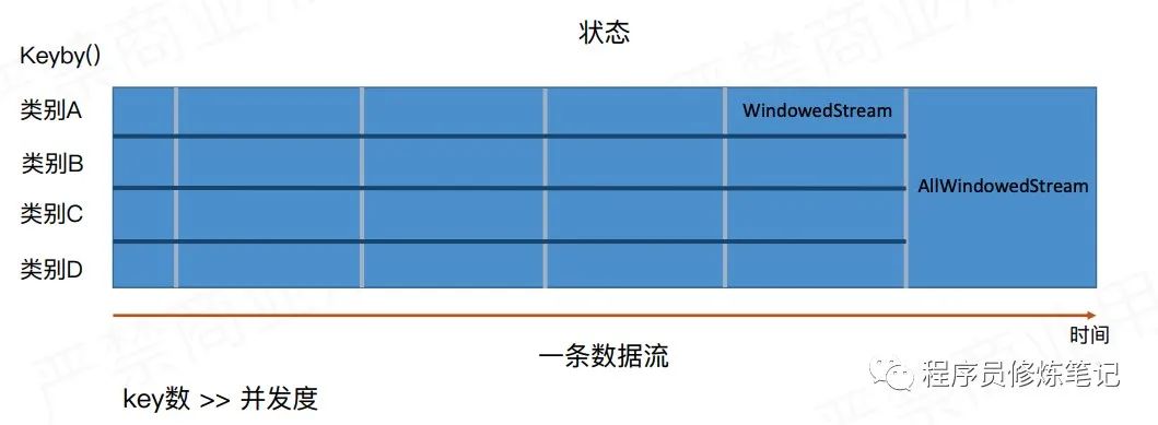 keyBy对流是在水平方向上切分,window是对流在纵向上进行切分,如下图: