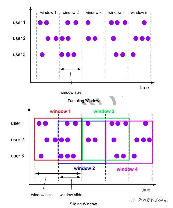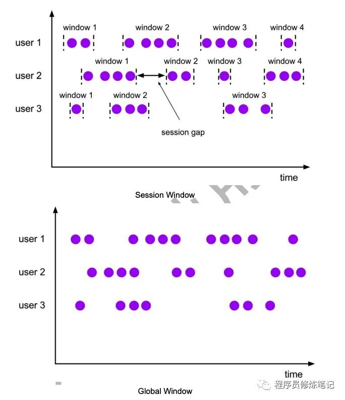 Tumbling Windows:窗口间的元素无重复 Sliding Windows:窗口间元素可能重复 Session Windows:窗口间的元素无重复 Global Windows:全局的window,默认永远不触发窗口,需要自定义Trigger来触发窗口