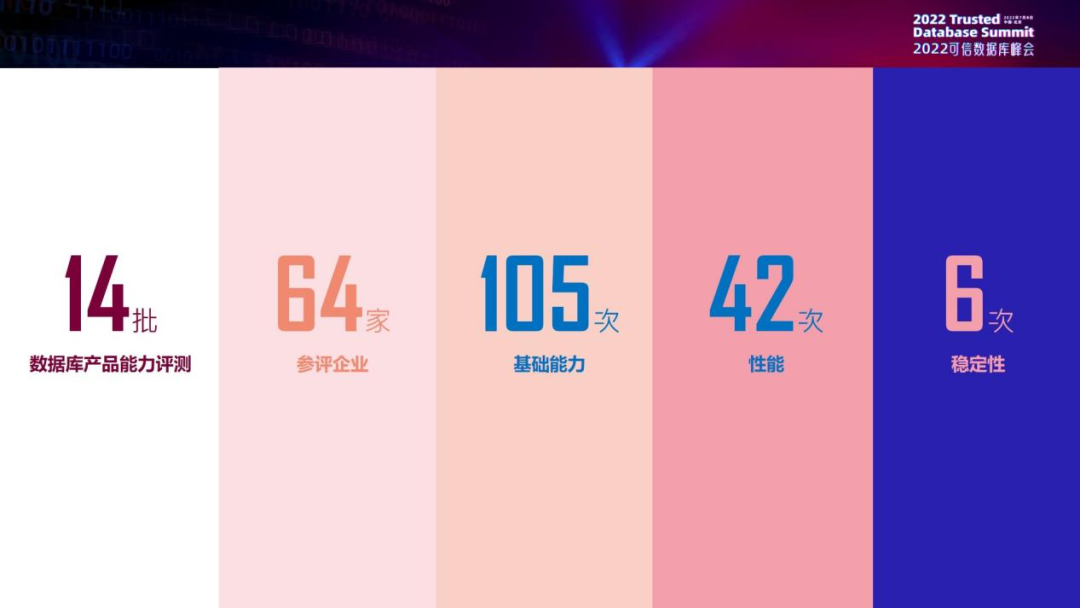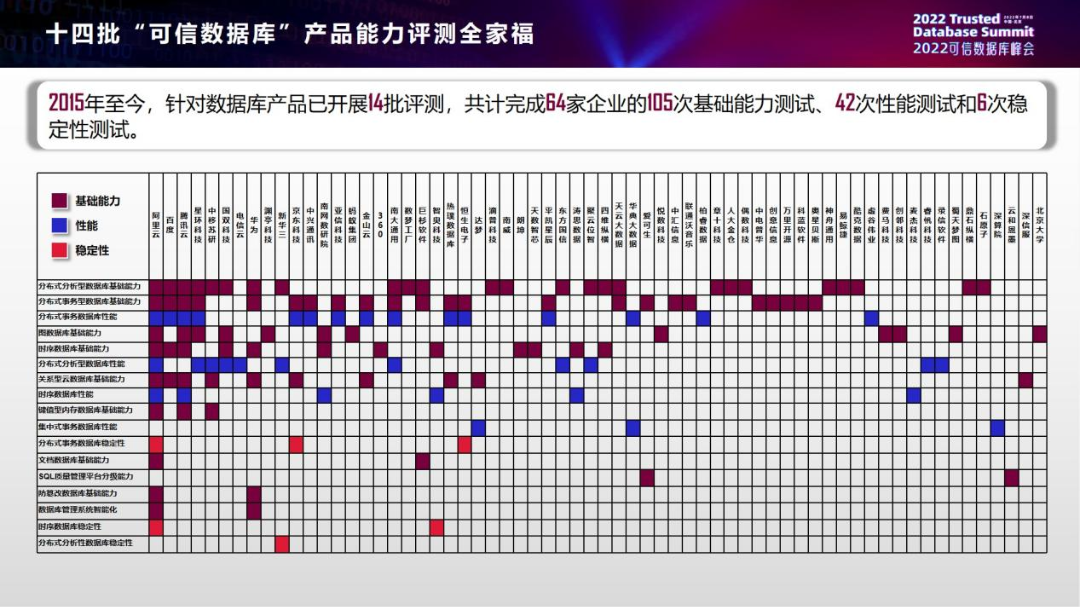 下面我给大家看一下整体的评测数据,信通院从2015年开始到现在开展了14批数据库产品能力评测,共计完成64家参评企业的105次基础能力测试,42次性能测试和6次稳定性测试。