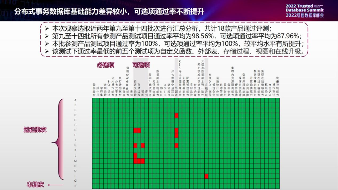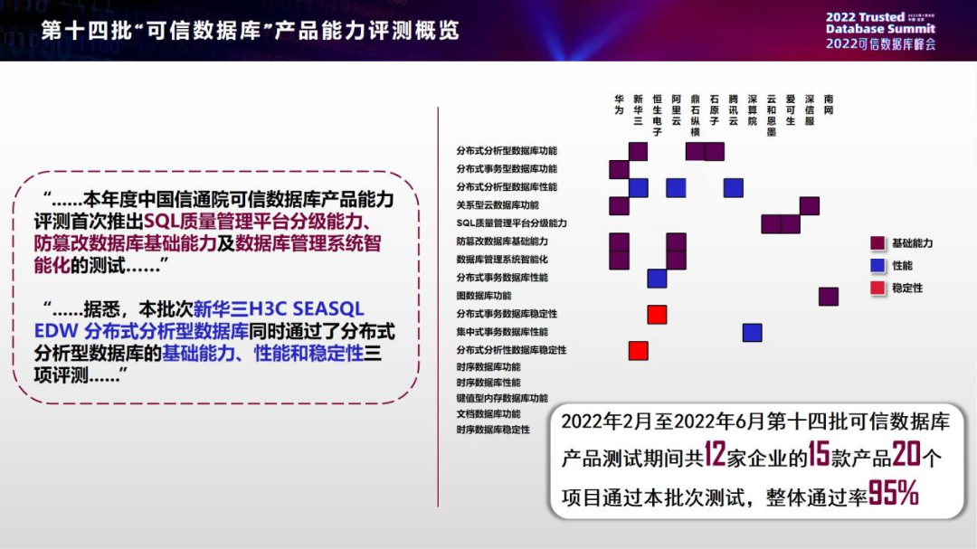 这页包括了14批评测的统计概览以及本批次需要着重介绍的情况。今年共有12家企业的15款产品20个项目通过了本次测试,有一款产品没有通过,整体通过率是95%。今年我们首次推出了SQL质量管理平台分级能力、防篡改数据库技术能力和数据库管理系统智能化的测试。我们在业内最快地为新型数据库制定了标准,并且真正在产业侧实践落地,以此来检验发现并推动产业侧突出的进展。值得注意的是,本期新华三H3C SEASQL EDW分布式分析型数据库同时通过了分布式分析型数据库的基础能力、性能和稳定性三项评测。