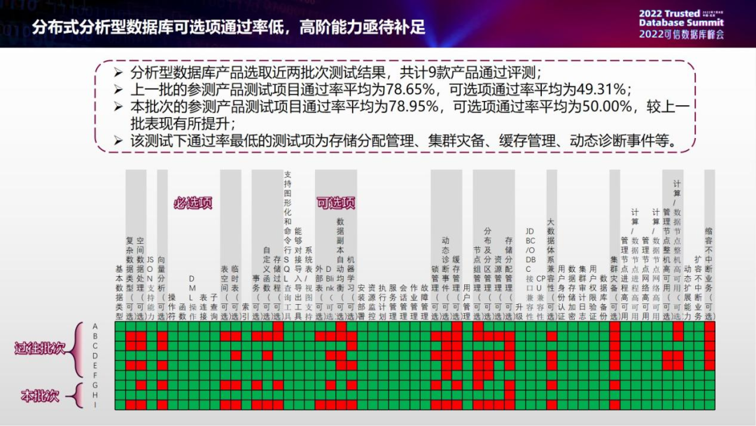 分布式分析型数据库产品基础能力评测首批开始于第七批大数据产品能力评测。因分布式分析型数据库产品基础能力评测标准在第十二批结束后有更新,本次观察选取参与更新后评测的第十三批和十四批次进行汇总分析,共计9款产品通过评测。分布式分析型数据库可选项通过率低,高阶能力亟待补足。上一批参评产品测试通过率平均是78.65%,可选项通过率平均49.31%,本批平均通过率78.95%,可选项平均是50.00%,近两批没有明显变化。通过率最低的项目分别是存储分配管理、集群灾备、缓存管理和动态诊断事件等。整体来看,大多数产品对可选项支持力度不是很好。