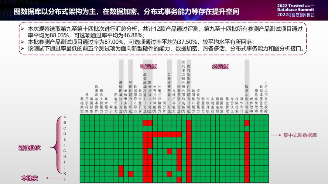 图数据库方面主要以分布式架构为主,在数据加密、分布式事务方面存在提升空间。本次选取了第9到第14批的批次,共计12款产品通过了评测。所有参测产品测试项目通过率平均是88.03%,可选项通过率平均为46.88%。本批参评产品通过率为87.00%,可选项通过率平均为37.50%,较平均水平有所回落。我们推测可能是近几年图数据库初创赛道大家又重新进入了,有一些新产品处于新研发阶段,所以能力稍显不足。该测试下通过率最低的前五个测试项分别为面向新型硬件的能力、数据加密、热备多活、分布式事务能力和图分析接口。