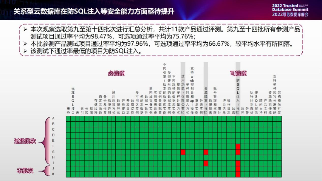 关系型云数据库就是今天一直在提的,包括云上托管的关系型云数据库或者云原生关系型数据库。在评测中,我们发现关系型云数据库在防SQL注入等安全能力方面亟待提升。我们评测观察也是选取了第9到第14批的产品情况进行汇总分析,一共11款产品。所有参评产品测试项目通过率平均为98.47%,可选项通过率平均为75.76%。本批参评产品通过率平均97.96%,可选项通过率平均66.67%,较平均水平有所回落。通过率最低的项目是防SQL注入,也就是安全方面的一个能力,有5家企业没有做到这个功能。