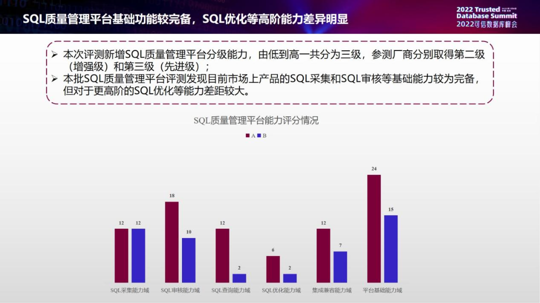 接下来是今年上半年刚推出的SQL质量管理平台。今年上半年两家企业参加,有两个样本,一家是二级、另一家是三级,我们总结SQL优化等高阶能力差别比较明显。图片下方是评测的几个能力域,这六个能力域中可以看出来SQL采集和SQL审核,就是通用的对SQL的操作能力比较完备。但是对于高阶优化能力差别比较大,同时也可以看到在优化能力方面两家表现都有待提高,所以在更高阶的能力方面仍有提升空间。