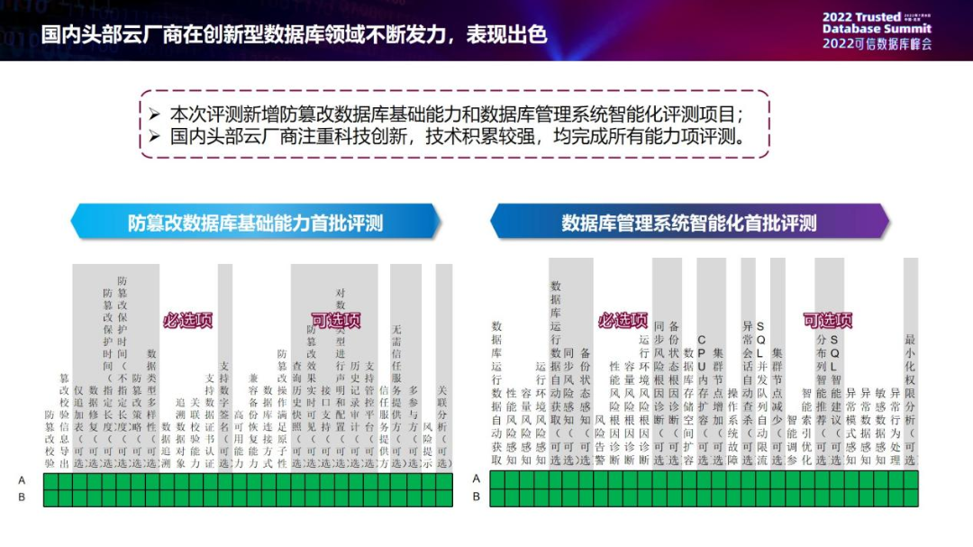 下面是刚才提到的今年上半年新增的防篡改数据库和数据库管理系统智能化的评测项目。今年上半年在防篡改数据库和AI数据库方向,都有两家企业做了评测,而且都是以全满分的情况通过了评测。我们推断敢第一批尝鲜的都是对自己产品比较有信心的,有充足的实力准备的,所以表现得的确是比较好。评测的主体都是国内的头部云厂商,可以看到国内头部云厂商比较注重整体的创新能力,技术积累比较强,均完成了所有能力项的评测,这是我们今年上半年在防篡改和AI数据库两个方面评测的情况。