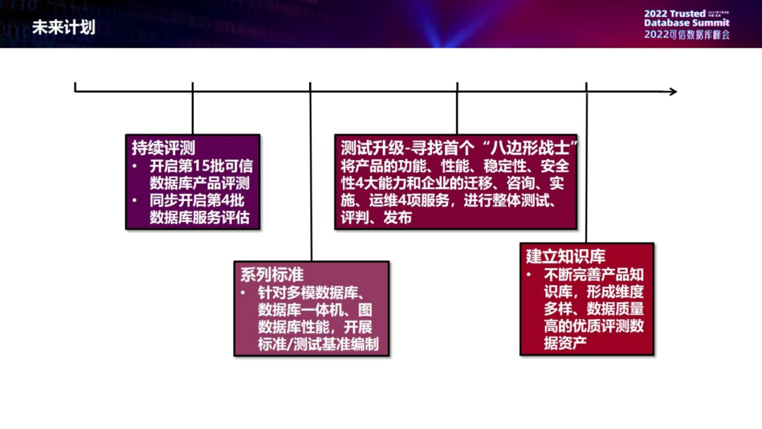 【持续评测】在评测领域我们做了很多年,所以也积累了一些经验。无论是从工具角度,从测评的过程角度,从质量的角度,我们都踩过很多坑,也总结出很多实践。我们有很多工具,也已经覆盖了很多产品类型,包括供给侧、应用侧等等。所以未来我们会持续开展评测,马上在会后,今年下半年会开启第15批可信数据库的评测,同步开启第四批数据库服务能力的评估。