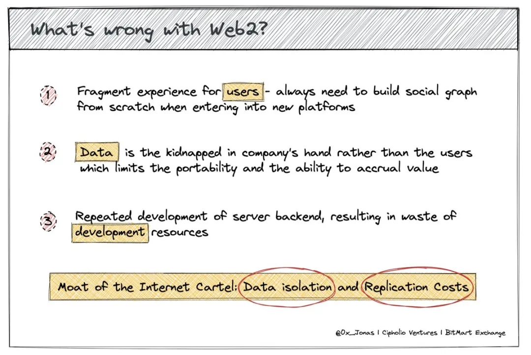 2/14 天下苦秦久矣。Web2 的巨头长期掌握着用户数据所有权和使用权,通过数据直接或间接牟利的手段更是层出不穷。而用户在迁移新协议时也面临社交图谱的缺失带来破碎的使用体验,开发者也需要重复搭建不同的用户管理系统。一切都是如此的肮脏和低效,开发者和用户都不得不向掌握数据主权的大公司屈服。