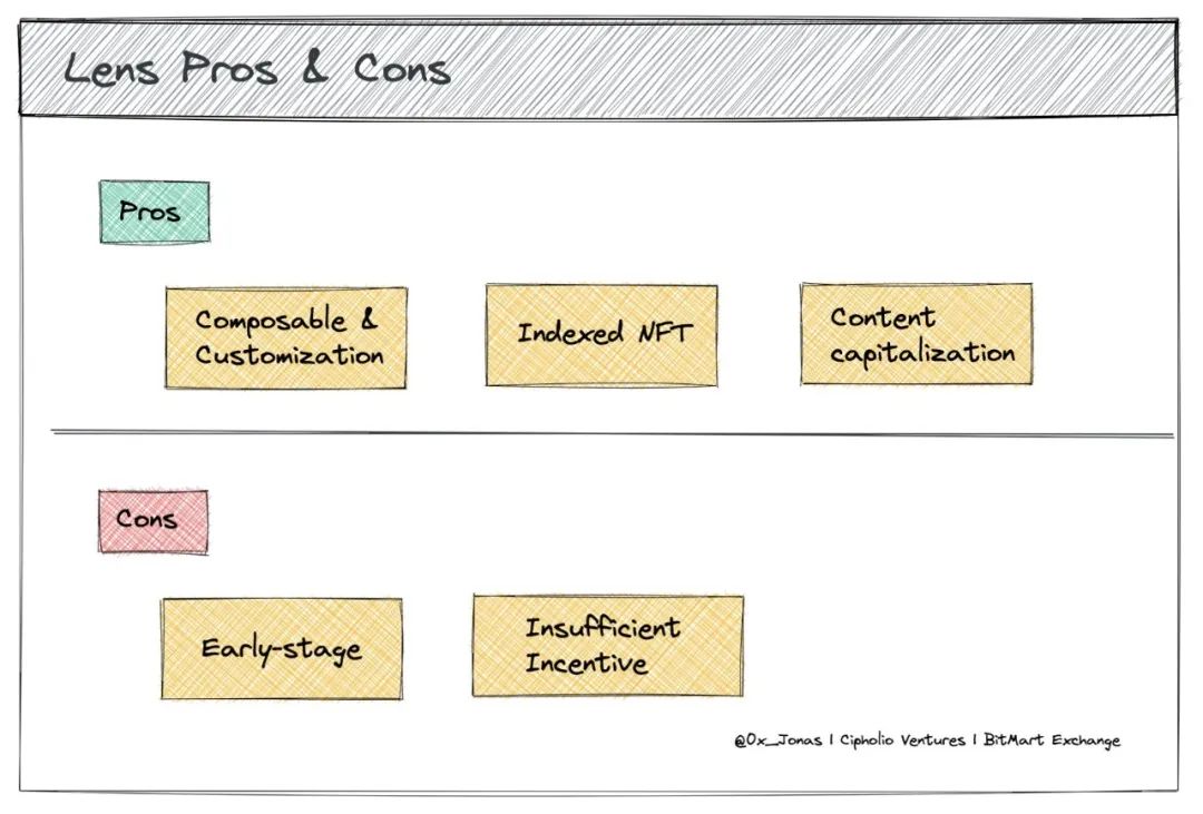 10/14. Lens 带来的核心价值体现在社交数据记录的开放化,精细化和资产化。当社交关系成为公共设施,用户就可以带着沉淀的社交关系体验任何新的产品,而不会被任何一个产品所捆绑。NFT 的引入也给所有的用户行为刻上了资产属性。但由于协议较新目前没有成熟的生态,同样也面临经济模型不完善的问题。