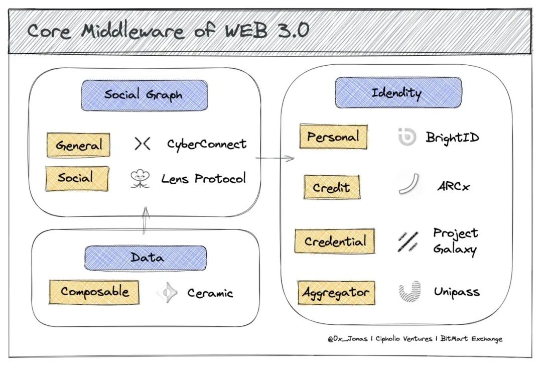 12/14. 至此我们拼凑出了一个相对完整的核心 Web3 中间件生态,即:以@ceramicnetwork为代表的底层数据存储网络,以@CyberConnectHQ和@LensProtocol为核心的社交图谱协议,以及按不同目的和性质划分的身份主权生态。