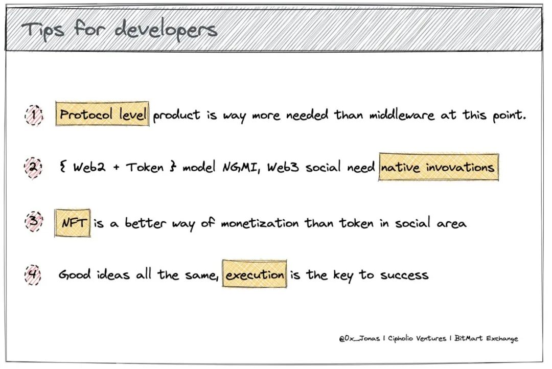 13/14. 对 Web3 开发者的一些建议:1. 现今需要更多中间件的应用场景而不是中间件本身。2. Web2 产品发币的简单模型很难走通,需要一些更原生的创新。3. Web3 产品中 NFT 比 Token 更容易进行价值捕获。4. 好的想法千篇一律,执行力才是项目能生存胜出的关键。