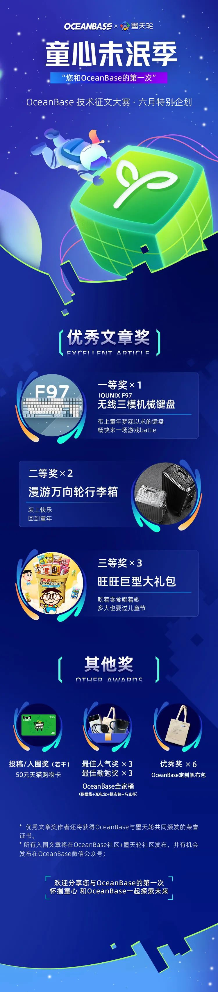 2022年6月,OceanBase 迎来了 12 岁的生日,值此特殊节点,OceanBase 联合墨天轮推出了「六月征文特别企划」——童心未泯季,分享您和 OceanBase 的第一次。