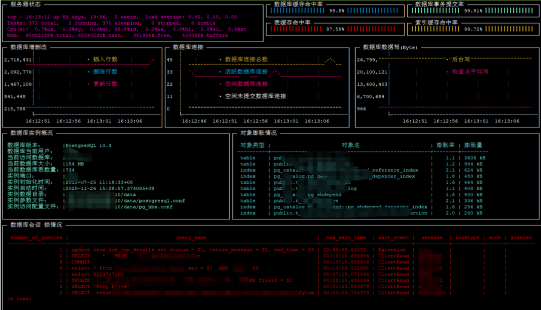 variables:PGPASSWORD: xxxxxxpostgres_connection: psql -h localhost -U postgres -p 5432 -d test --no-align--tuples-onlyruncharts:- title: 数据库数据写(Byte)position: [[52, 6], [28, 11]]rate-ms: 1000legend:enabled: truedetails: falsescale: 0items:- label: 后台写color: 178init: $postgres_connectionsample: select bs.block_size * (buffers_checkpoint + buffers_clean + buffers_backend)as total_writen from pg_stat_bgwriter,(SELECT CAST(current_setting('block_size') AS INTEGER) AS block_size) AS bs;- label: 检查点平均写color: 162init: $postgres_connectionsample: select buffers_checkpoint * bs.block_size (checkpoints_timed + checkpoints_req)as checkpoint_write_avg from pg_stat_bgwriter,(SELECT CAST(current_setting('block_size') AS INTEGER) AS block_size) AS bs;- title: 数据库连接position: [[24, 6], [28, 11]]rate-ms: 1000legend:enabled: truedetails: falsescale: 0items:- label: 数据库连接总数init: $postgres_connectionsample: select count(*) from pg_stat_activity;- label: 活跃数据库连接init: $postgres_connectionsample: select count(*) from pg_stat_activity where state = 'active' and pid<> pg_backend_pid();- label: 空闲数据库连接init: $postgres_connectionsample: select count(*) from pg_stat_activity where state = 'idle' and pid<> pg_backend_pid();- label: 空闲未提交数据库连接init: $postgres_connectionsample: select count(*) from pg_stat_activity where state = 'idle in transaction'and pid <> pg_backend_pid();- title: 数据库增删改position: [[0, 6], [24, 11]]rate-ms: 1000legend:enabled: truedetails: falsescale: 0items:- label: 插入行数init: $postgres_connectionsample: select tup_inserted from pg_stat_database where datname = current_database();- label: 删除行数init: $postgres_connectionsample: select tup_deleted from pg_stat_database where datname = current_database();- label: 更新行数init: $postgres_connectionsample: select tup_updated from pg_stat_database where datname = current_database();gauges:- title: 数据库缓存命中率position: [[39, 0], [21, 3]]rate-ms: 1000scale: 2color: 32percent-only: truecur:init: $postgres_connectionsample: select round(sum(blks_hit)*100/sum(blks_hit+blks_read),2)::numericfrom pg_stat_database where datname = current_database();max:sample: echo 100min:sample: echo 0- title: 表缓存命中率position: [[39, 3], [21, 3]]rate-ms: 1000scale: 2color: 160percent-only: truecur:init: $postgres_connectionsample: SELECT SUM(heap_blks_hit)*100 nullif(SUM(heap_blks_hit) + SUM(heap_blks_read),0) FROM pg_statio_user_tables;max:sample: echo 100min:sample: echo 0- title: 索引缓存命中率position: [[60, 3], [20, 3]]rate-ms: 1000scale: 2color: 178percent-only: truecur:init: $postgres_connectionsample: SELECT (SUM(idx_blks_hit))*100 nullif(SUM(idx_blks_hit + idx_blks_read),0) FROM pg_statio_user_indexes;max:sample: echo 100min:sample: echo 0- title: 数据库事务提交率position: [[60, 0], [20, 3]]rate-ms: 1000scale: 2color: 122percent-only: truecur:init: $postgres_connectionsample: select round(100*(xact_commit::numeric/(case when xact_commit > 0then xact_commit else 1 end + xact_rollback)),2)::numeric as commit_ratiofrom pg_stat_database where datname = current_database();max:sample: echo 100min:sample: echo 0textboxes:- title: 服务器状态position: [[0, 0], [39, 6]]rate-ms: 500color: 200sample: top -bn 1 | head -n 5- title: 数据库会话 锁情况position: [[0, 29], [80, 12]]rate-ms: 1000color: 160sample: psql -h localhost -U postgres -p 5432 -d test -c "SELECT COUNT(pg_stat_activity.pid)AS number_of_queries,substring(TRIM(leading FROM regexp_replace(pg_stat_activity.query,'[\n\r]+'::text, ' '::text, 'g'::text)) FROM 0 FOR 80) AS query_name,MAX(age(current_timestamp,query_start)) AS max_wait_time,wait_event,usename,locktype,MODE,granted FROMpg_stat_activity LEFT JOIN pg_locks ON pg_stat_activity.pid = pg_locks.pidWHERE query != '<IDLE>' AND query NOT ilike '%pg_%' AND query NOT ilike '%application_name%'AND query NOT ilike '%inet%' AND age(current_timestamp, query_start) > '5milliseconds'::INTERVAL GROUP BY query_name,wait_event,usename,locktype,MODE,grantedORDER BY max_wait_time DESC;"- title: 数据库实例概况position: [[0, 17], [34, 12]]rate-ms: 1000color: 122init: $postgres_connectionsample: select '数据库版本:' opttype,substring(version(),'(.*) on ') union allselect '数据库当前用户:',current_role union all select '当前访问数据库:',current_database()union all select '当前数据库大小:',pg_size_pretty(pg_database_size(current_database()))union all select '当前数据库表数量:',count(*)::varchar from pg_tables where schemanamenot in('pg_catalog','information_schema') union all select '实例端口:',settingfrom pg_settings where name = 'port' union all select '实例初始化时间:',to_timestamp(((system_identifier>>32)& (2^32 -1)::bigint))::varchar from pg_control_system() union all select '实例启动时间:',pg_postmaster_start_time()::varcharunion all select '实例数据目录:',setting from pg_settings where name = 'data_directory'union all select '实例参数文件:',setting from pg_settings where name = 'config_file'union all select '实例访问配置文件:',setting from pg_settings where name = 'hba_file';- title: 对象膨胀情况position: [[34, 17], [46, 12]]rate-ms: 1000color: 80sample: psql -h localhost -U postgres -p 5432 -d test -c "WITH constants AS (SELECTcurrent_setting('block_size') ::NUMERIC AS bs, 23 AS hdr, 4 AS ma), bloat_infoAS (SELECT ma, bs, schemaname, tablename, (datawidth + (hdr + ma - (CASE WHENhdr%ma = 0 THEN ma ELSE hdr%ma END))) ::NUMERIC AS datahdr, (maxfracsum *(nullhdr + ma - (CASE WHEN nullhdr%ma = 0 THEN ma ELSE nullhdr%ma END))) ASnullhdr2 FROM (SELECT schemaname, tablename, hdr, ma, bs, SUM((1 - null_frac)* avg_width) AS datawidth, MAX(null_frac) AS maxfracsum, hdr + (SELECT 1 +COUNT(*) 8 FROM pg_stats s2 WHERE null_frac <> 0 AND s2.schemaname = s.schemanameAND s2.tablename = s.tablename) AS nullhdr FROM pg_stats s, consta