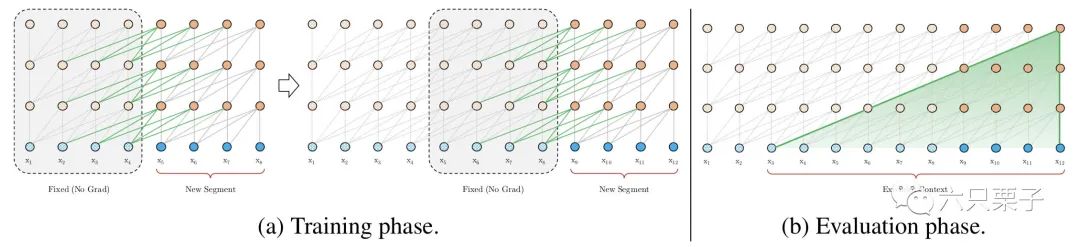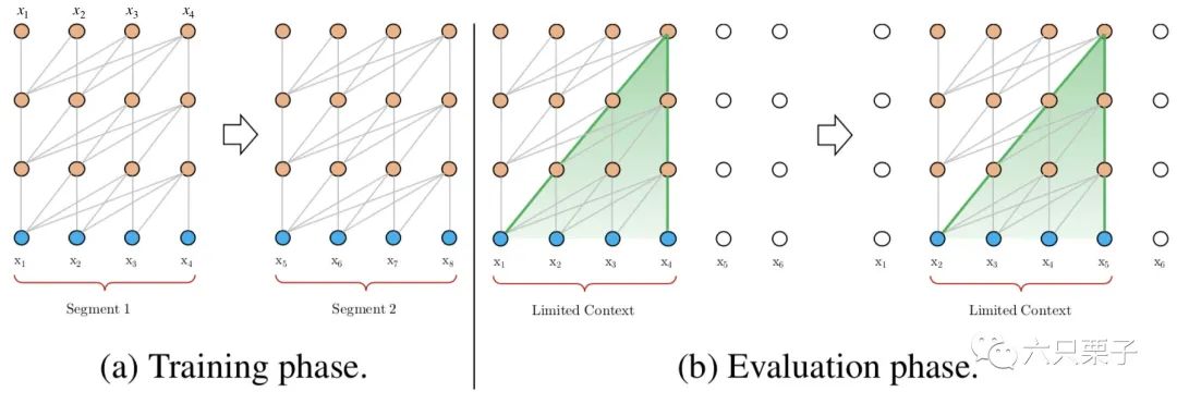 如下图所示,在训练阶段,它分别对第一块中的 和第二块中的 进行建模;在测试阶段,由于每次处理的最大长度为4,当模型处理序列 时,无法构建与历史 的关系。另外,由于需要以滑动窗口的方式处理整个序列,所以这种方式效率十分低下。