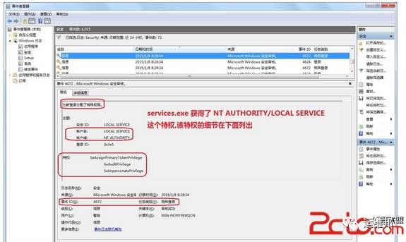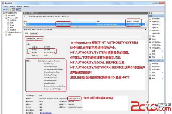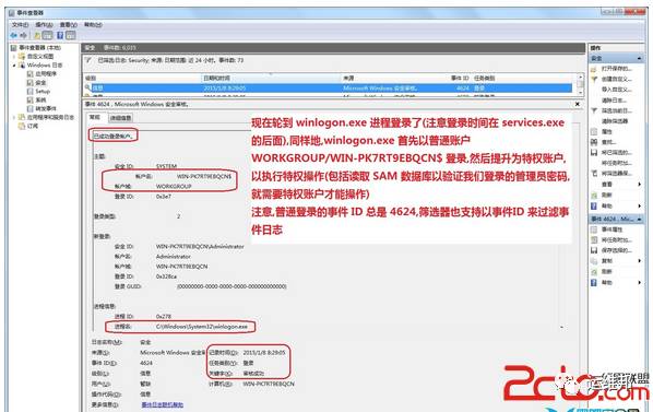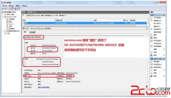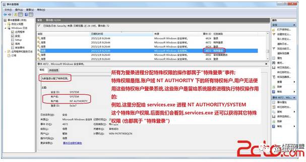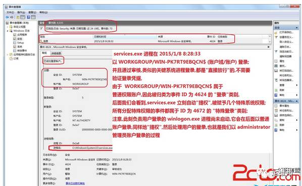 除了 winlogon.exe 进程外,其它一些系统进程也会在用户登录前,使用特殊帐户先行登录。这些登录事件同样可以在事件查看器中一览无遗,