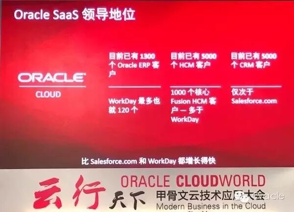 在旧金山的OOW上,Larry事实上早已经发布了Oracle在云上取得的成绩,这包括:1300家ERP客户,5000家HCM客户,500家CRM客户。在Oracle选定的新的竞争对手中,WorkDay不在话下,Salesforce是Oracle今年追赶和超越的目标。