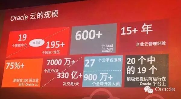 事实上,Oracle的云已然初具规模:19个数据中心,服务全球195个以上的国家和地区;7000万用户/天 在云上执行330亿次以上的交易;Oracle 600个以上的SaaS应用;服务着财富100强中75%的客户。