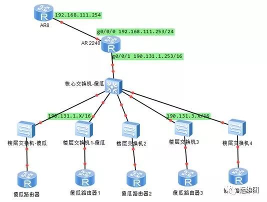 注意:核心和楼层交换机都是傻瓜型的,不能配置。网关在AR路由器上,用户均通过傻瓜路由器接入,傻瓜路由器分为两个网段,分别为190.131.1.0/16和190.131.3.0/16
