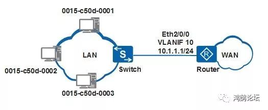 组网需求如图1所示,Router为企业网关,企业内部用户通过Router访问互联网。现要求限制局域网内某些主机访问互联网,但是由于这些主机可以变换IP地址,所以通过防火墙限制不能有效防范,最合适的做法是基于源MAC地址进行限制。在本例中可以实现限制某些主机访问互联网,但是可以访问网关。