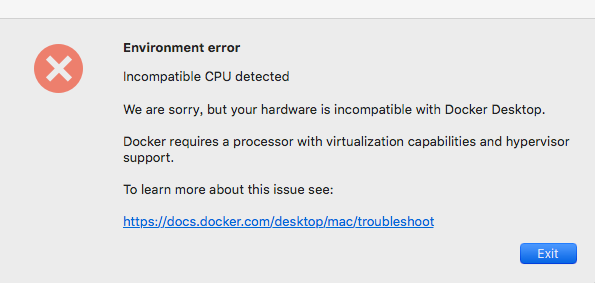:在安装Docker的过程中,经历了许多失败,这款MacBook Pro可以算是废品,不能正常安装Docker,安装完成后打开会提示CPU不兼容。Incompatible CPU detectedWe are sorry, but your hardware is incompatible with Docker Desktop.Docker requires a processor with virtualization capabilities and hypervisor support.