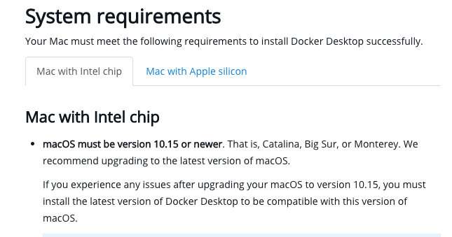If you experience any issues after upgrading your macOS to version 10.15, you must install the latest version of Docker Desktop to be compatible with this version of macOS.):