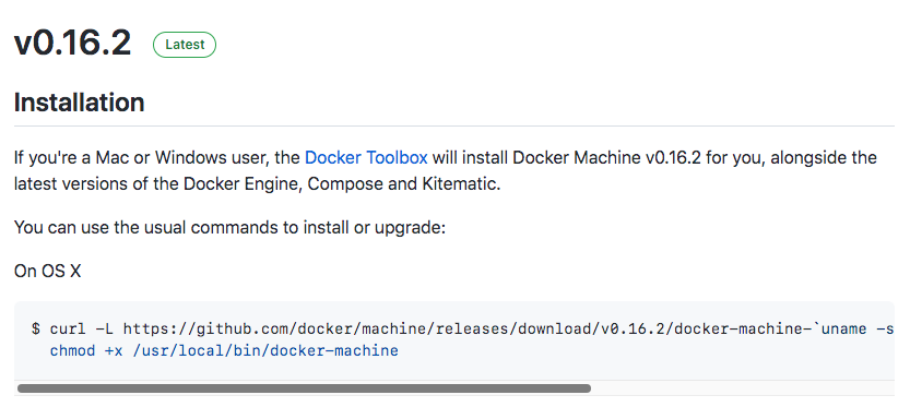 # Github docker-machinehttps://github.com/docker/machine/releases# 网站提示方法$ curl -L https://github.com/docker/machine/releases/download/v0.16.2/docker-machine-`uname -s`-`uname -m` >/usr/local/bin/docker-machine && \chmod +x usr/local/bin/docker-machine