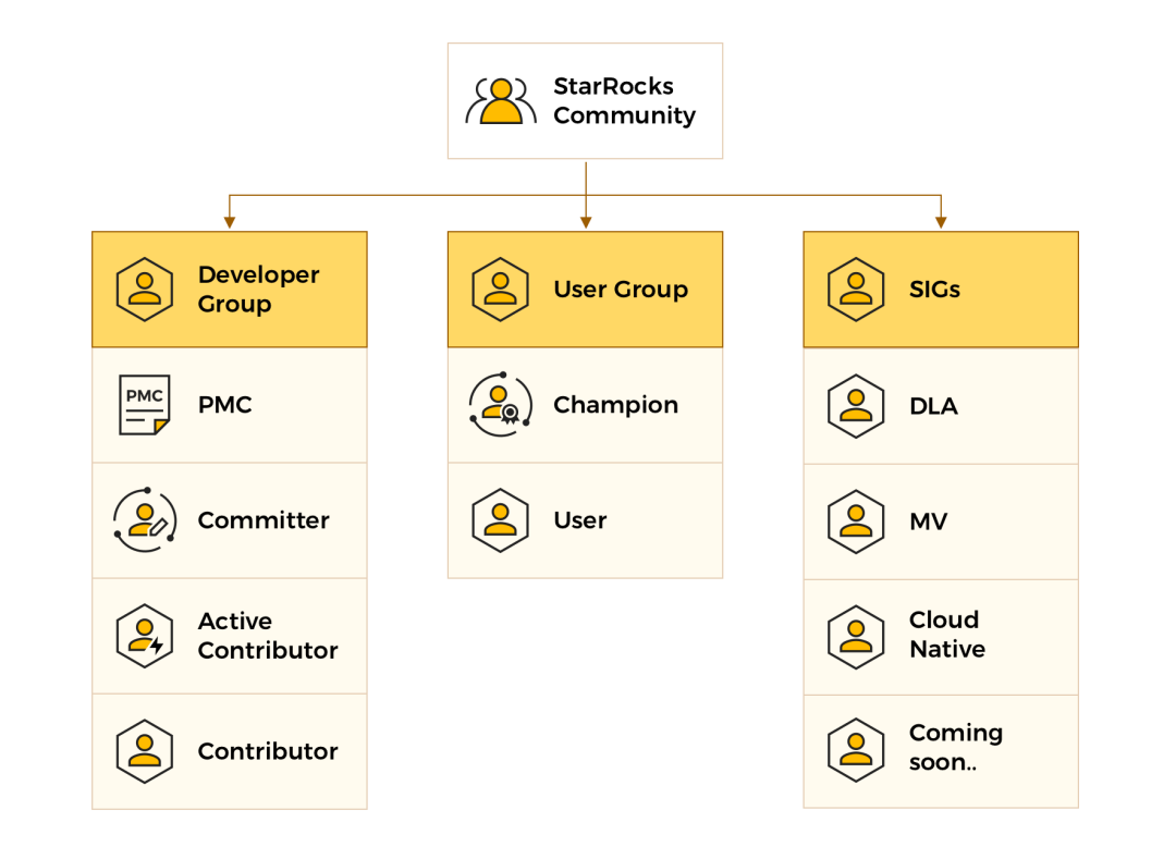 我们把社区分成了以代码共建为主的 Developer Group、由众多使用 StarRocks 的用户所组成的 User Group, 还有不同的 SIGs (专项兴趣小组),让开发者可以根据自己的兴趣和能力投身到自己感兴趣的项目/组织中。