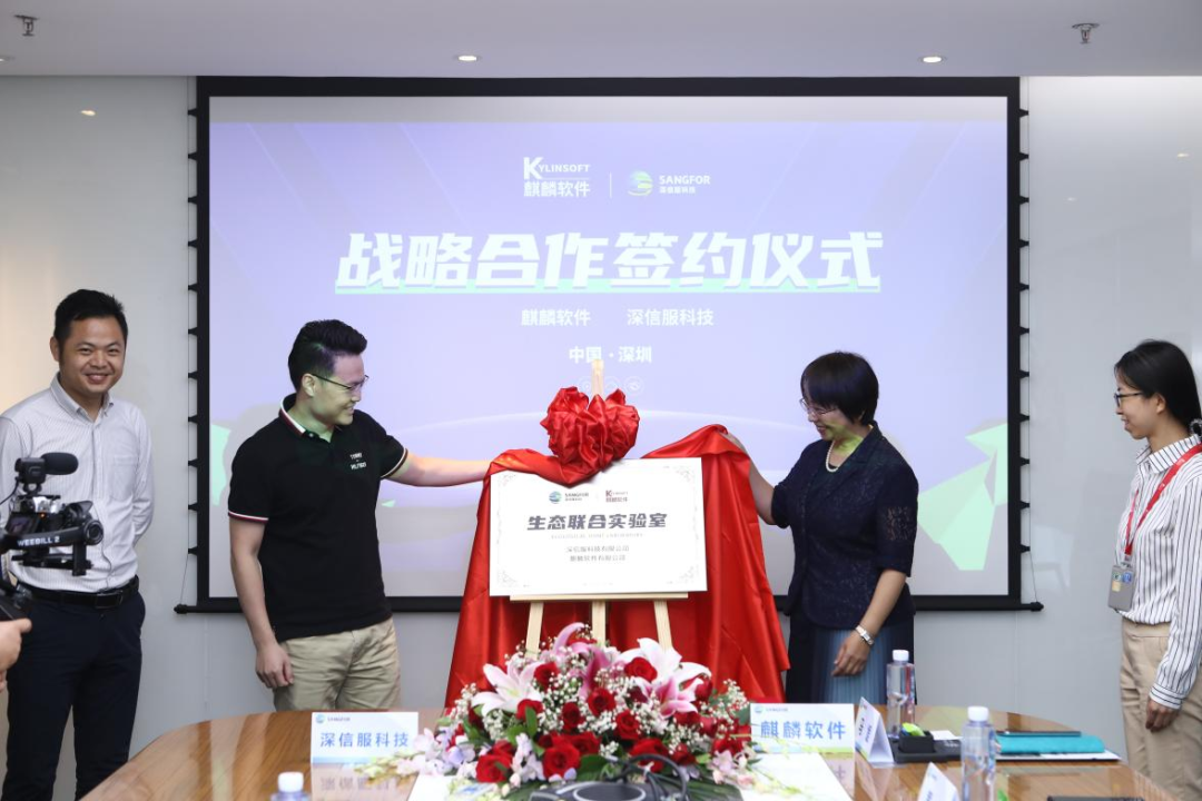 麒麟软件副总裁姚翎、深信服副总裁陈小亮为生态联合实验室揭牌,标志着麒麟软件与深信服建立更为坚实紧密的战略合作关系,双方将在技术领域努力互补,并在协同探索中持续创新。