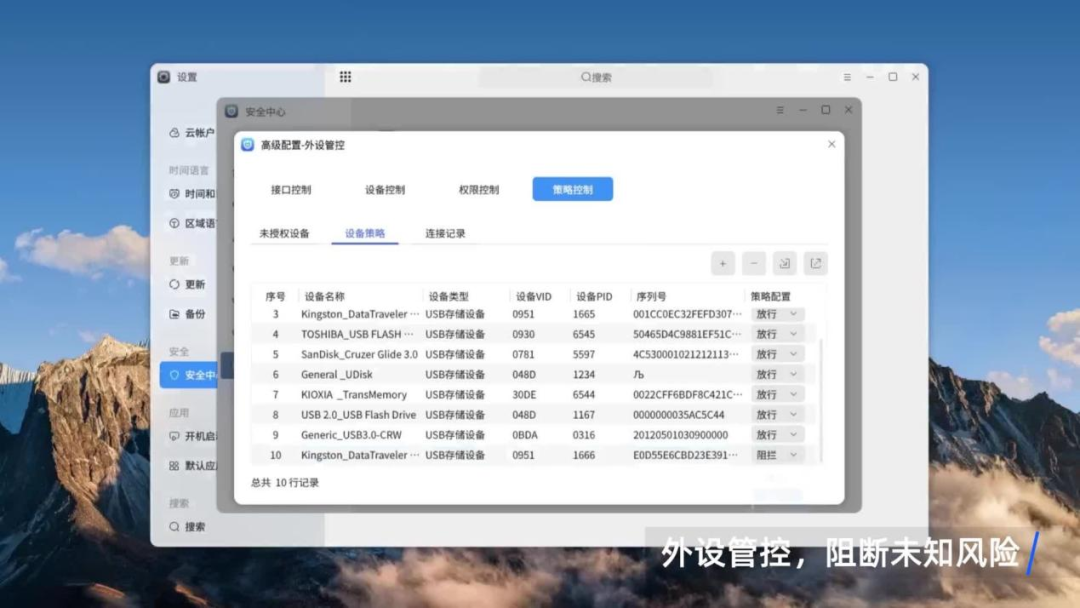 对于现代办公族而言,U盘、移动硬盘、打印机等已经成为我们日常工作中经常使用的外接设备,尤其是使用USB接口的存储设备,用来交换数据非常方便。遇到重要文件,更是有很多人还会用USB存储设备进行备份保存。然而“树莓知更鸟”(Raspberry Robin)正是通过被感染的USB设备(如U盘)进行传播。虽然“树莓知更鸟”病毒对于国产操作系统威胁较小,但移动存储设备安全问题不容忽视,银河麒麟桌面操作系统V10 (SP1) 2203的外设管控功能就可有效加强USB设备的防护,确保设备使用安全。