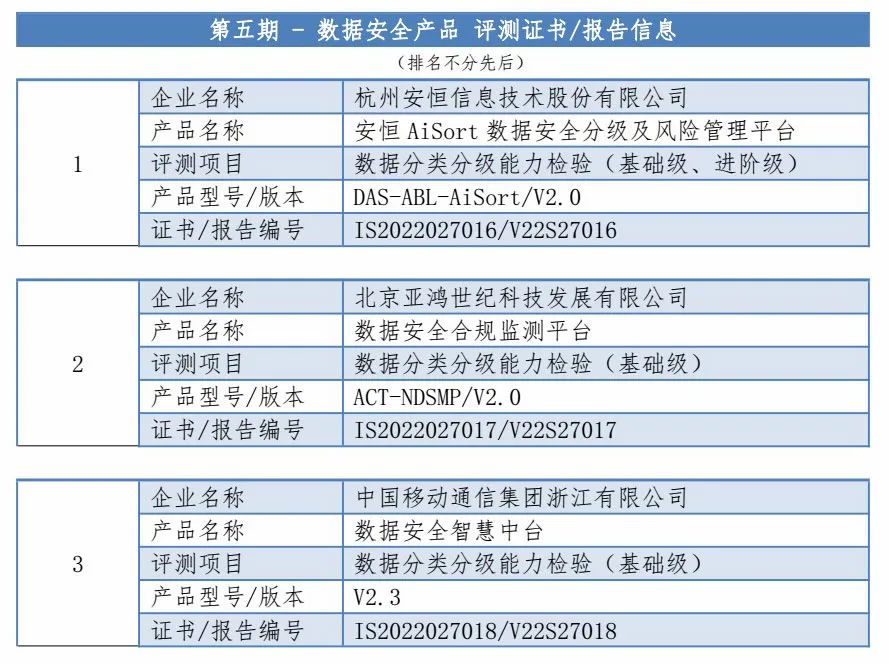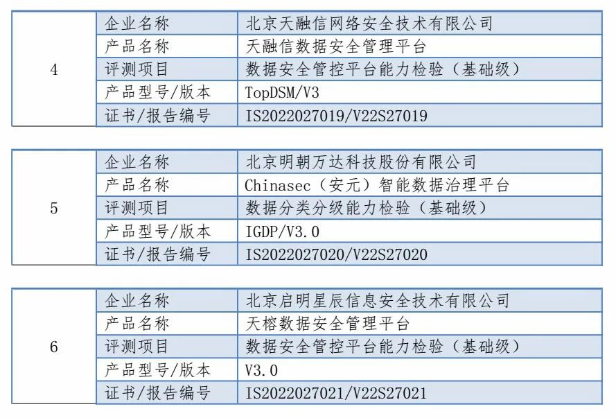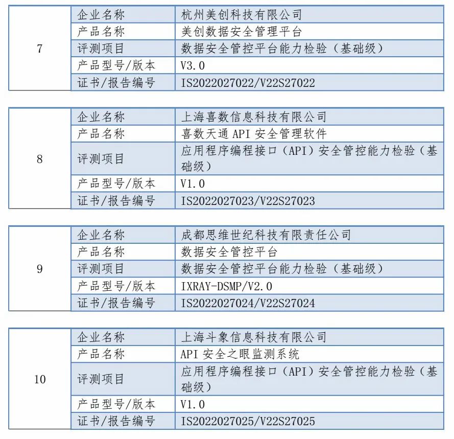 本期数据安全产品检验共有10家企业通过了相关产品测评,检测通过数据安全产品10个,涉及功能类型11类。