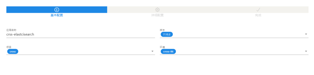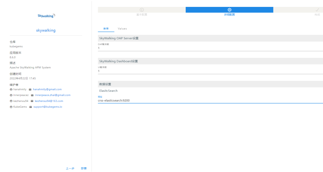 同样在应用商店找到skywalking应用,填写基本信息,进入详细配置页,将数据设置为ES应用名称与端口