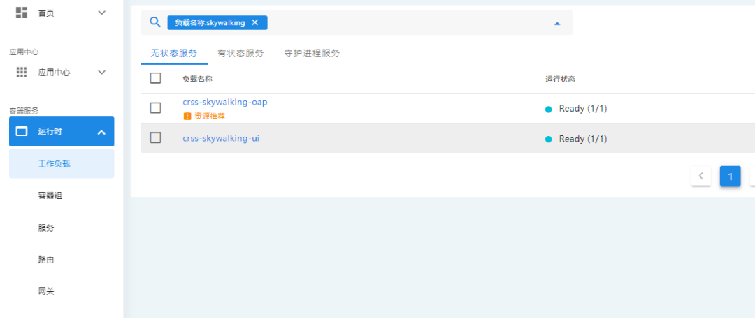 点击部署,可以看到skywalking-oap、skywalking-ui服务已经部署完成